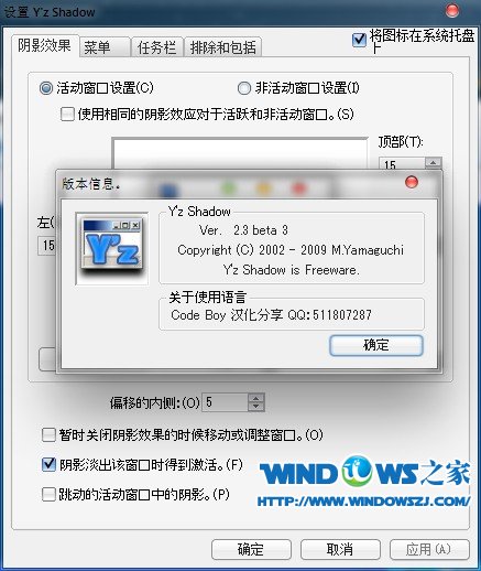 YzShadow桌面美化软件是一款作用于Windows XP下的桌面美化软件,它能使您桌面上任何窗口和菜单的边框产生阴影效果,当然你可以定义阴影的各项属性(例如:阴影的方向和范围、深度和偏移度以及阴影的颜色)。