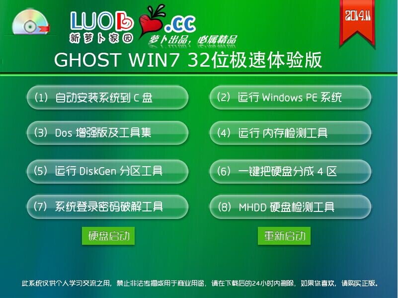 (Win7旗舰版32位萝卜家园V201411最新版)源于win732位原版基础上进行适当精简和优化的系统,集成最新,最常见的电脑系统软件与win732位系统驱动,并且系统干净无毒,按照用户使用习惯作细心设置,在前几个版本的基础上作了重大改善,拥有萝卜家园win7旗舰版独有